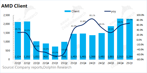 AMD的客户端业务在2025年第一季度实现收入23亿美元,同比增长67.7%,是本季度明显超预期(20.6亿美元)的一项。客户端的增长,主要得益于第五代锐龙CPU销量的提升。