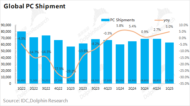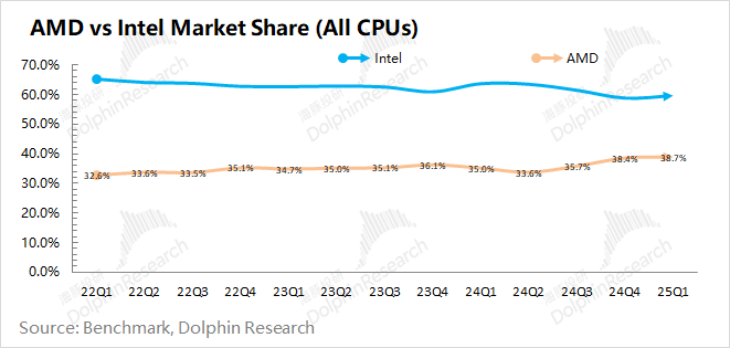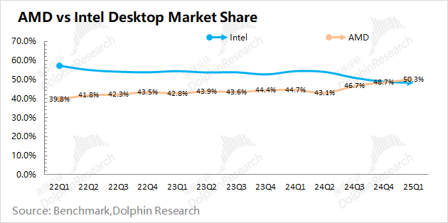 结合行业数据看,2025年第一季度全球PC出货量6320万台,同比增长5%。与此同时,AMD的客户端业务却能取得67.7%的同比增长。相比来看,英特尔的客户端业务同比下滑7.8%。对比三者的增速表现,海豚君认为,整体PC市场仍在回暖,其中AMD在PC市场中获得了更明显的份额提升。