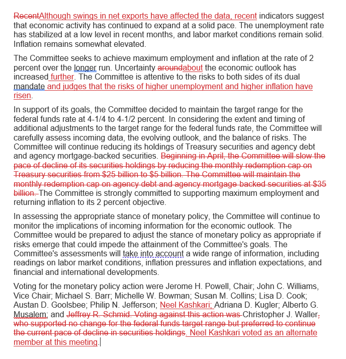 上次声明删除了“实现就业和通胀目标的风险大体均衡”这句话,新增一句“经济前景相关的不确定性增加”。本次声明则将这句话再次调整,改为“经济前景有关的不确定性进一步增加”,添加了“进一步”这个词,强调了“不确定性”增加的现实。