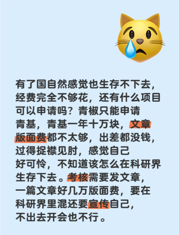 最终,科研人不得不面对“基金资助覆盖不了实验成本”的尴尬现实。更令人无奈的是,为了提升中标率,申请者需提前投入大量资金开展预实验,一旦申请失败,这些投入便成为“沉没成本”。有青椒坦言:“我每月工资不到1万,但预实验已经自费花了十几万,压力大到失眠。”