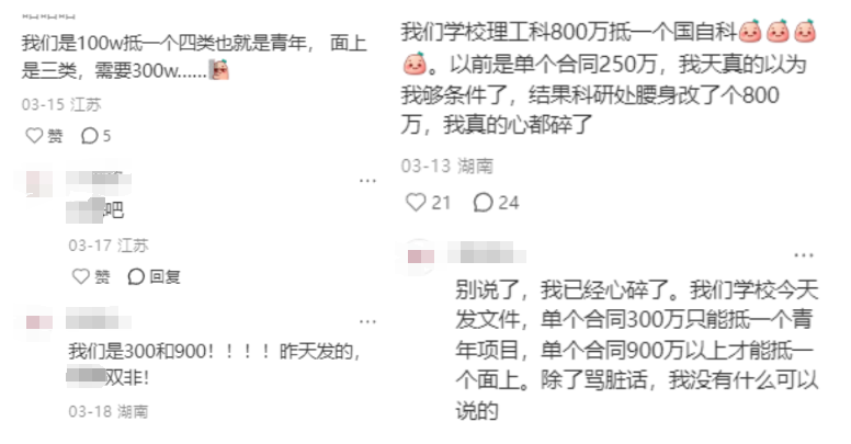 按说不同老师各有所长,评价标准不做“一刀切”算是好事。而让人哭笑不得的是,横向项目的经费门槛逐年飙升。一个国家级项目对标的横向项目经费标准,从几十万已经涨到了100万、300万,乃至800万……