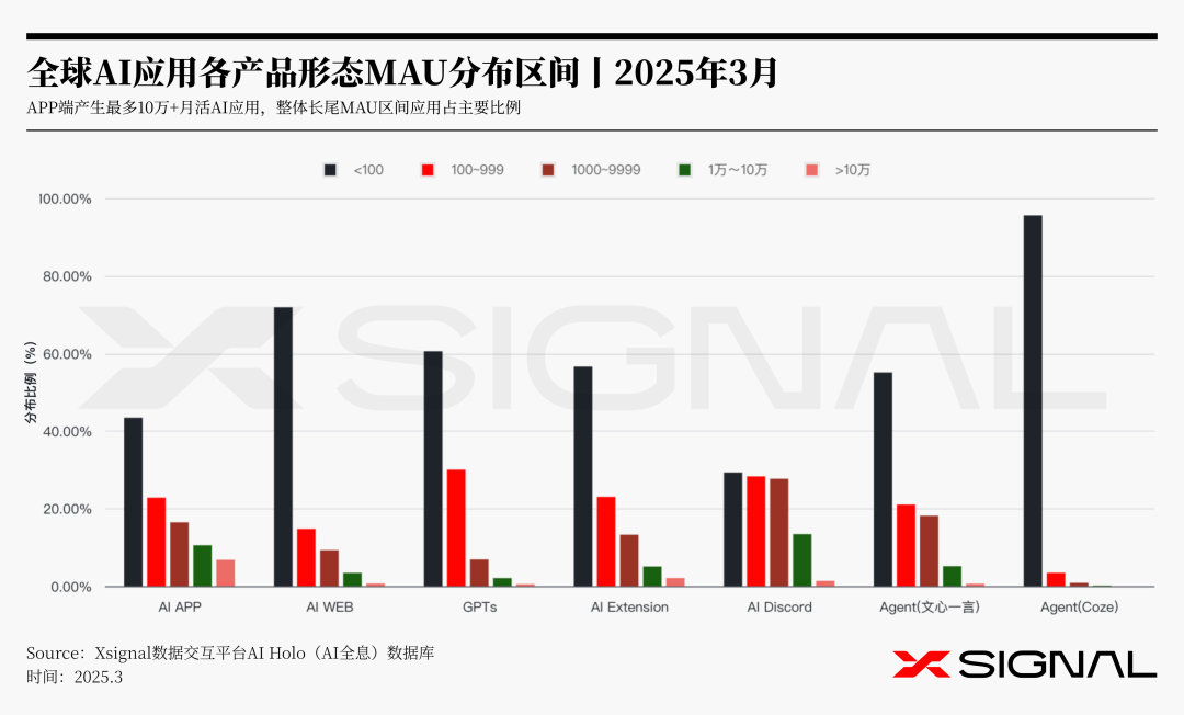 2025年3月,全球AI应用市场呈现多元化发展趋势,不同产品形态在MAU分布上展现出显著差异。根据Xsignal AI Holo(AI全息)数据库数据显示,AI应用的整体活跃度呈现明显的“长尾效应”,即大量低活跃度应用占据市场主流,而少数头部应用则在特定领域实现高用户粘性。