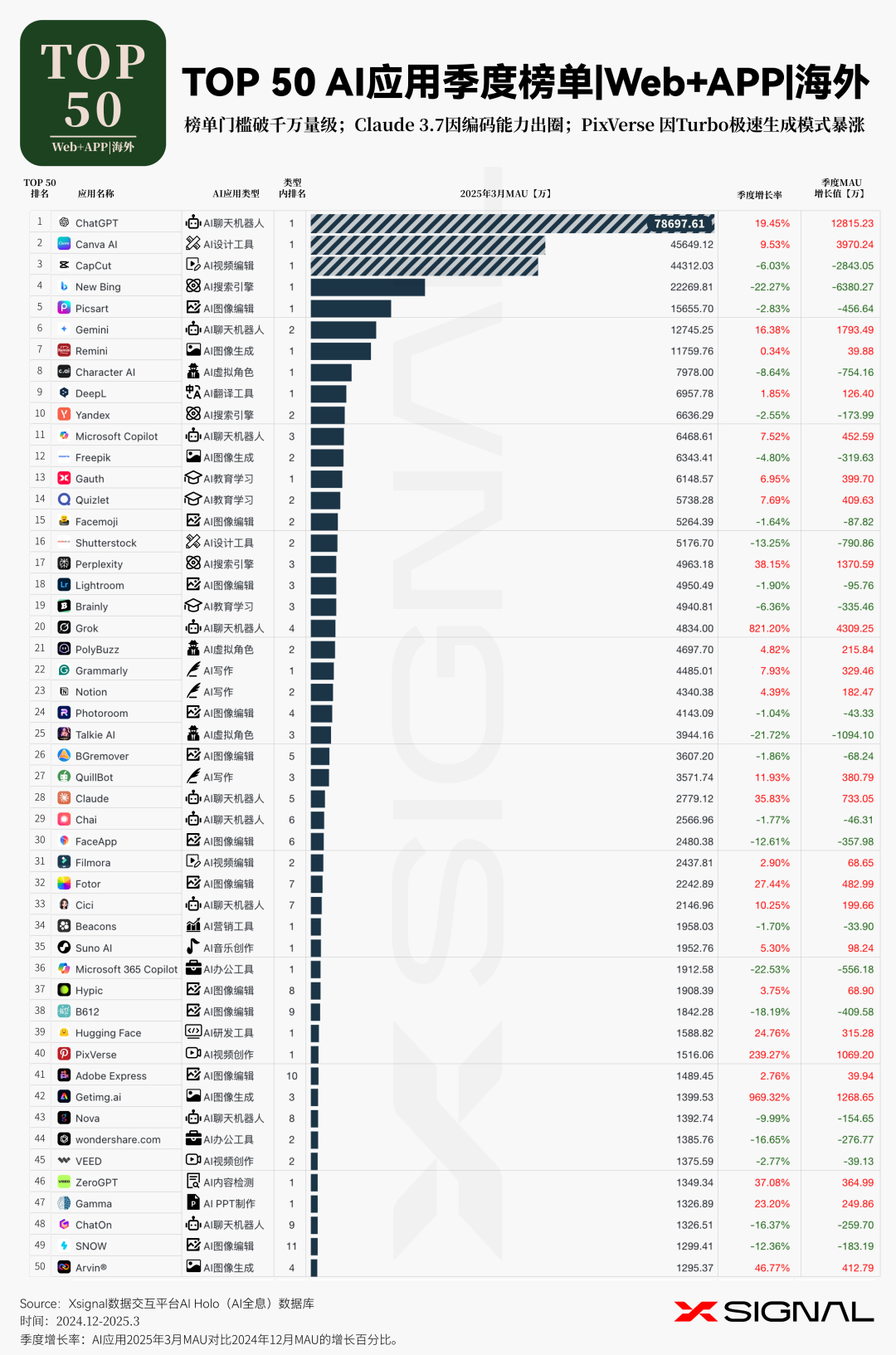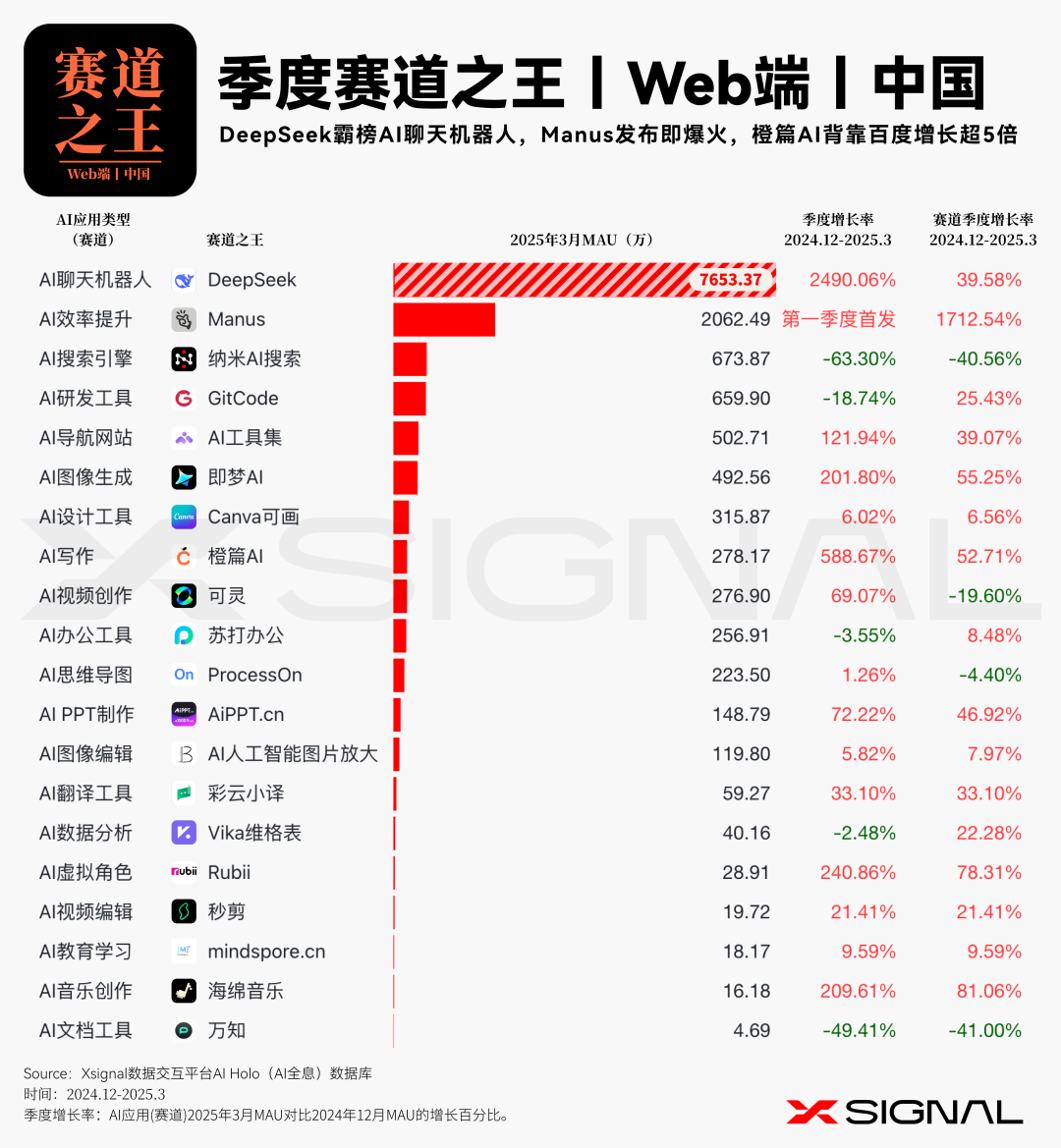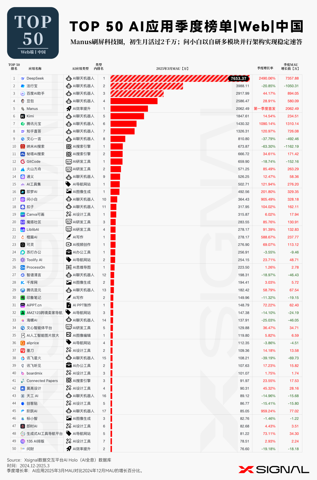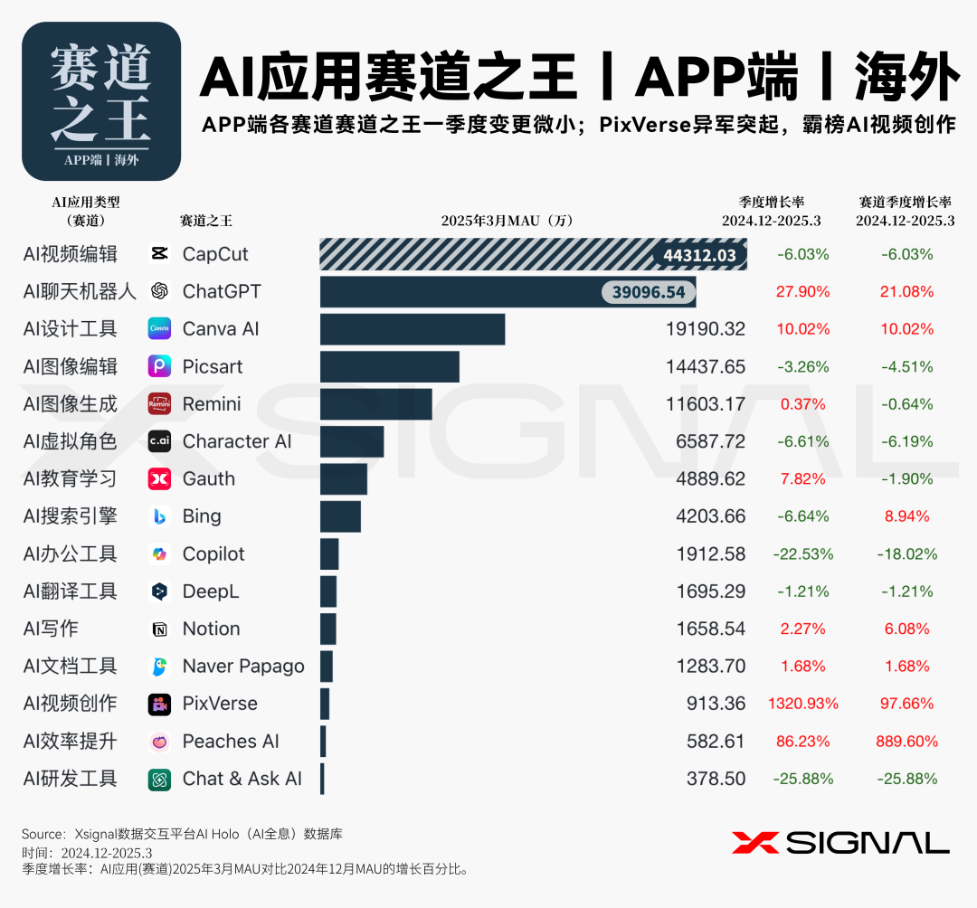 伴随人工智能技术的迅猛迭代,中国 AI 应用在全球市场的影响力正呈指数级攀升。 Xsignal AI Holo 数据平台 2024 年 12 月至 2025 年 3 月中国出海 AI 应用的详实数据,深入剖析其在海外市场的发展态势、整体格局与战略布局。