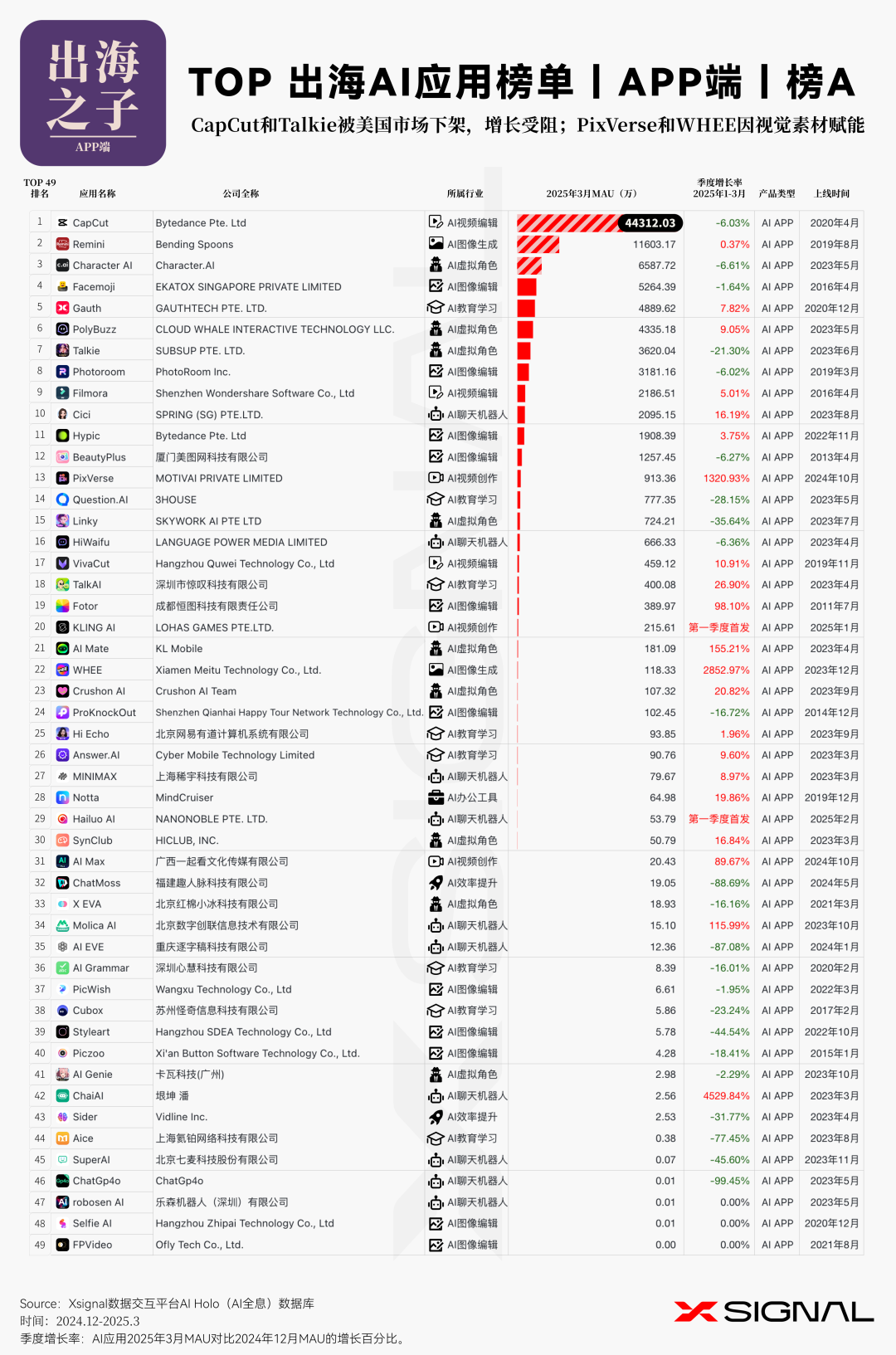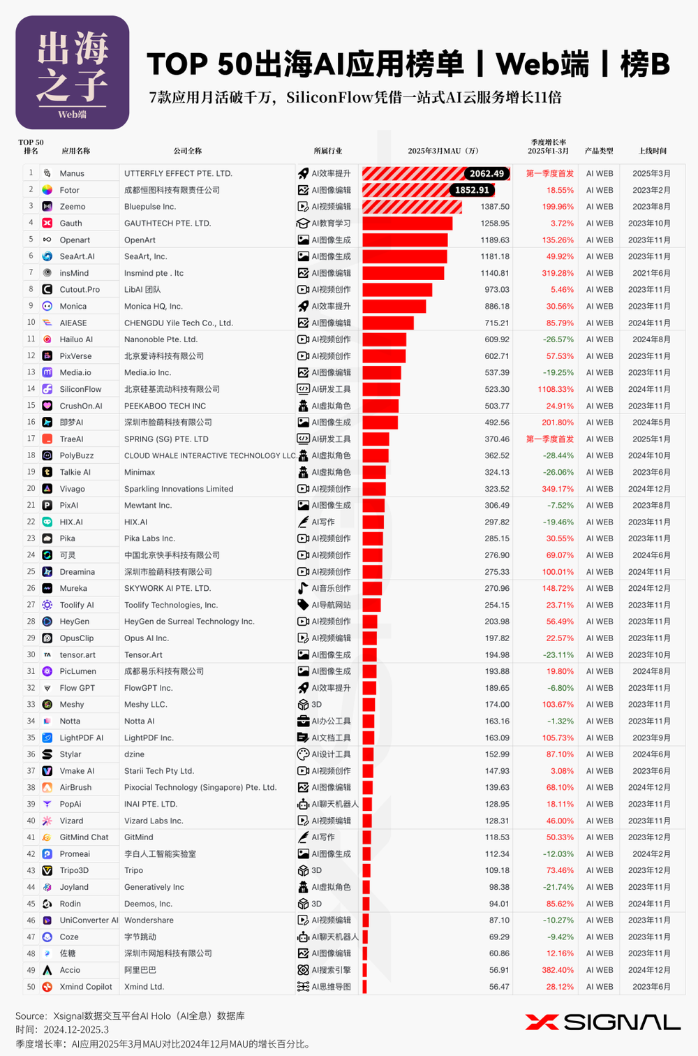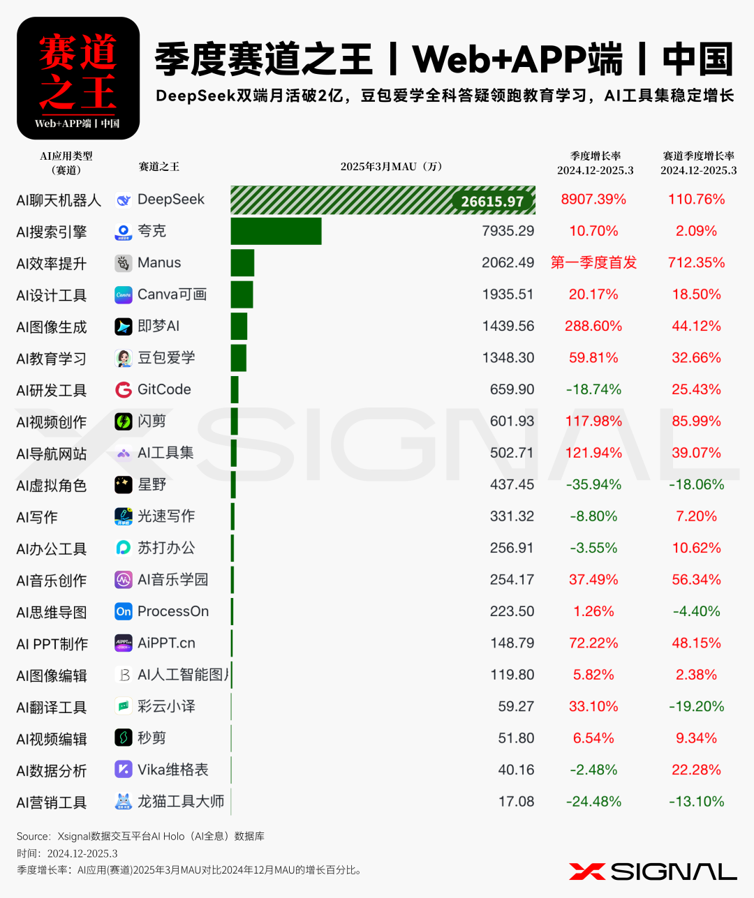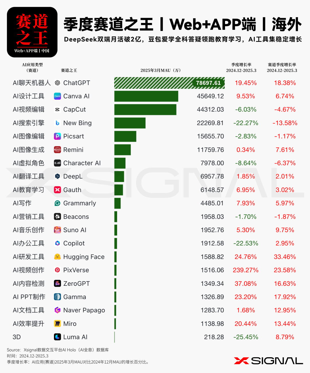 伴随人工智能技术的迅猛迭代,中国 AI 应用在全球市场的影响力正呈指数级攀升。 Xsignal AI Holo 数据平台 2024 年 12 月至 2025 年 3 月中国出海 AI 应用的详实数据,深入剖析其在海外市场的发展态势、整体格局与战略布局。