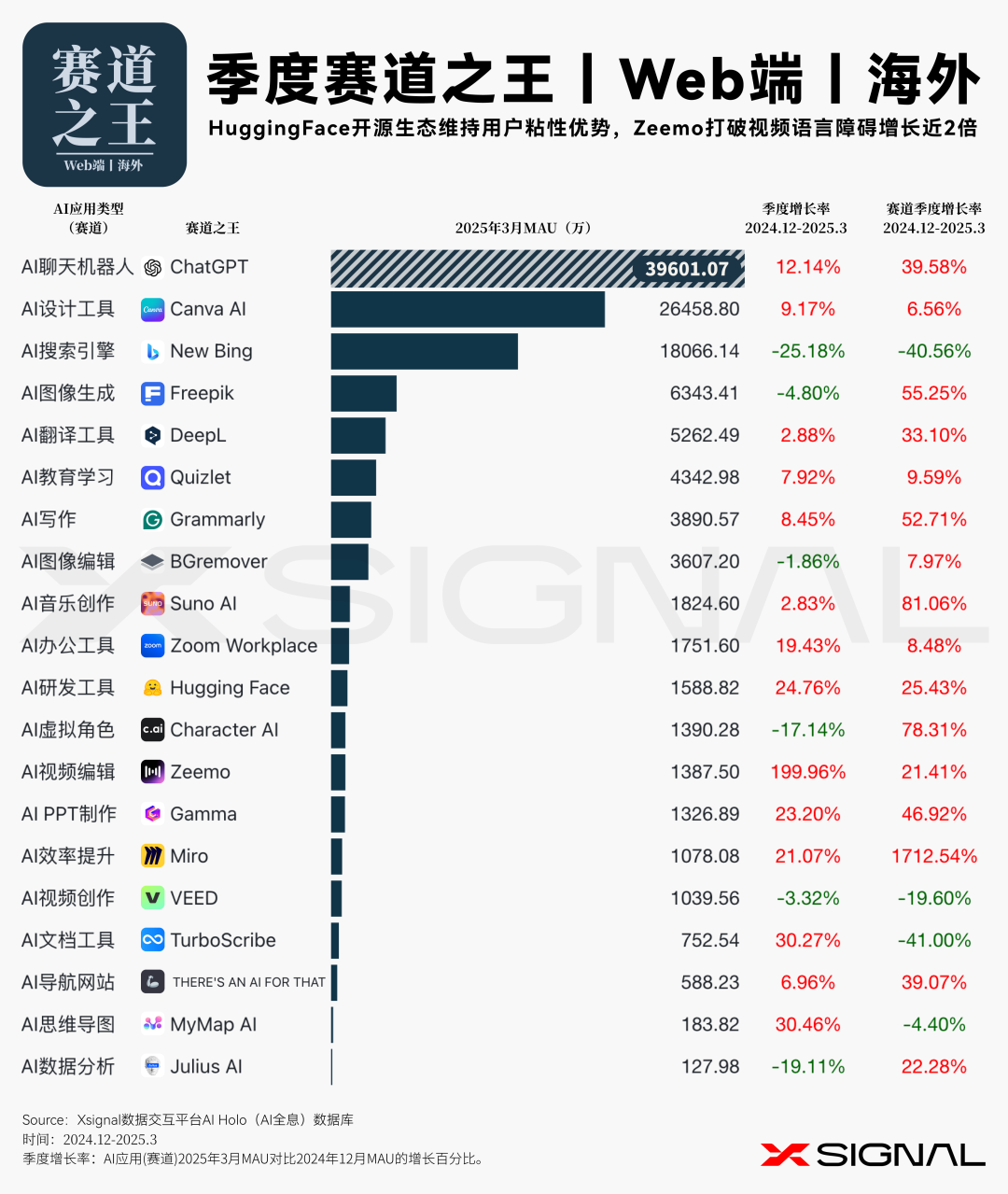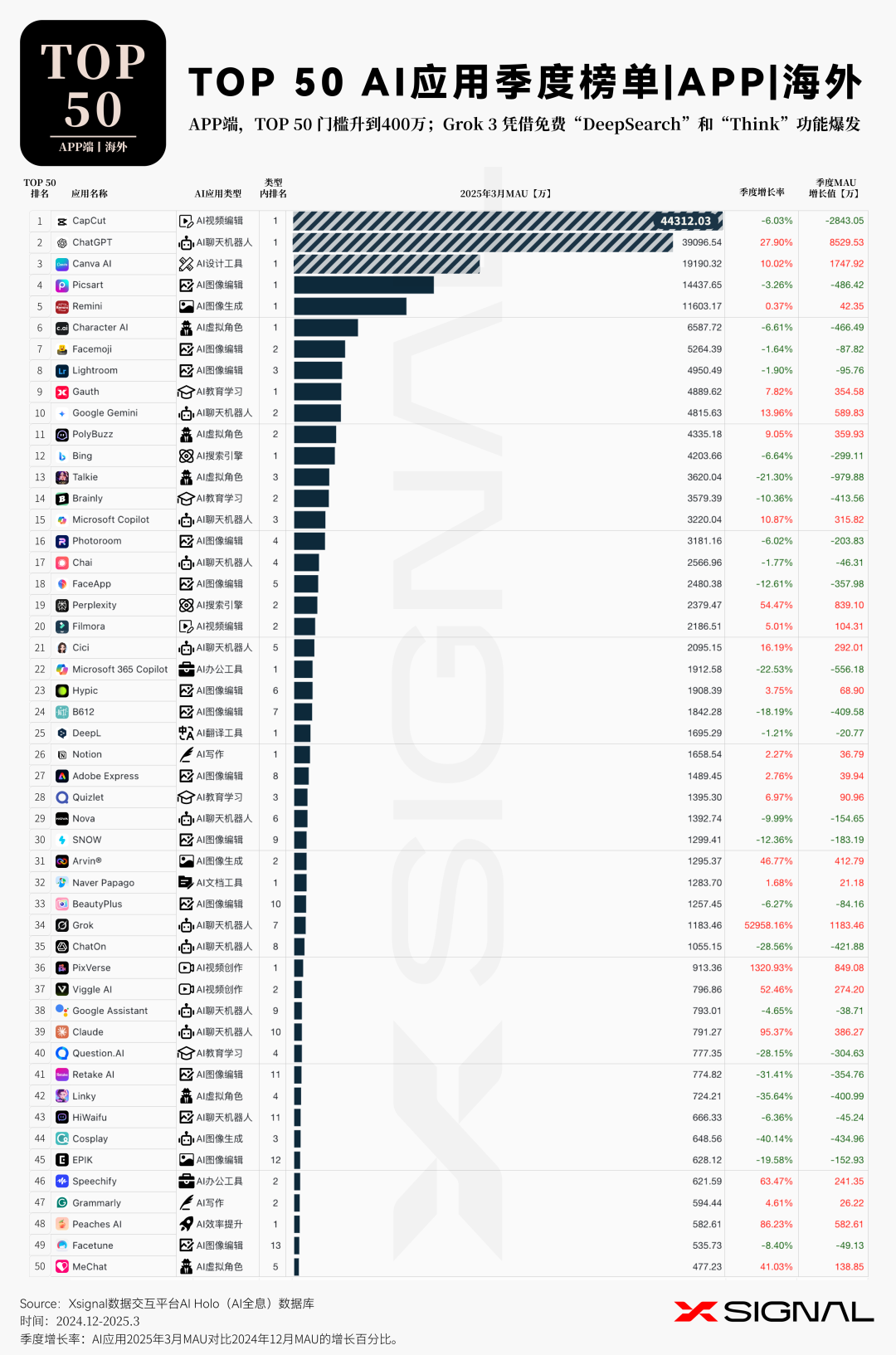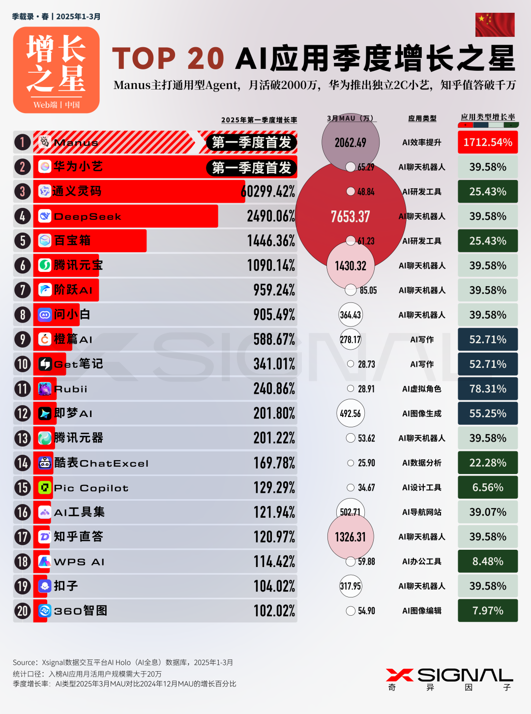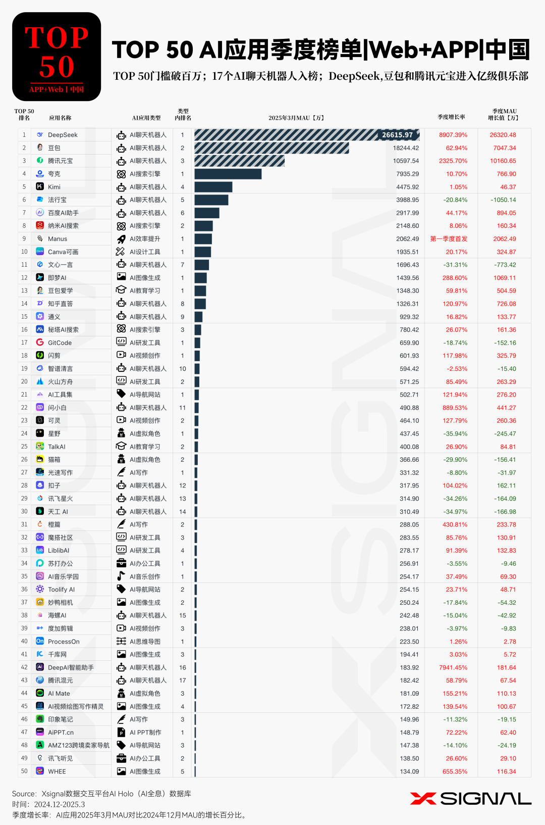伴随人工智能技术的迅猛迭代,中国 AI 应用在全球市场的影响力正呈指数级攀升。 Xsignal AI Holo 数据平台 2024 年 12 月至 2025 年 3 月中国出海 AI 应用的详实数据,深入剖析其在海外市场的发展态势、整体格局与战略布局。