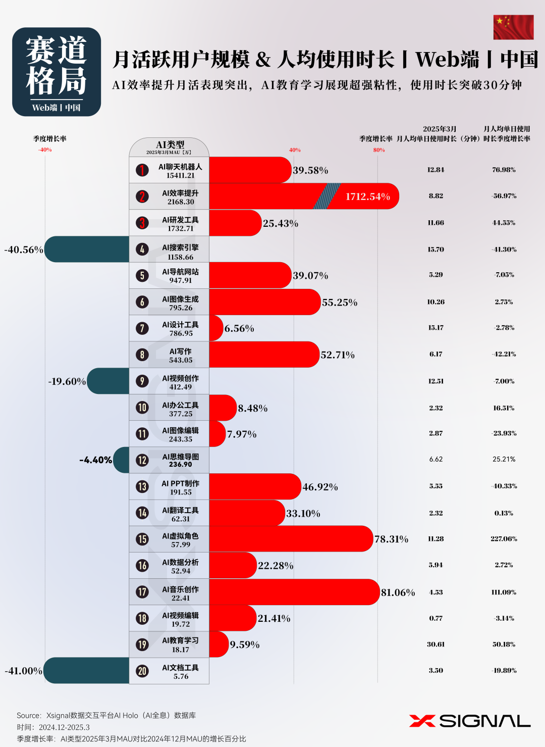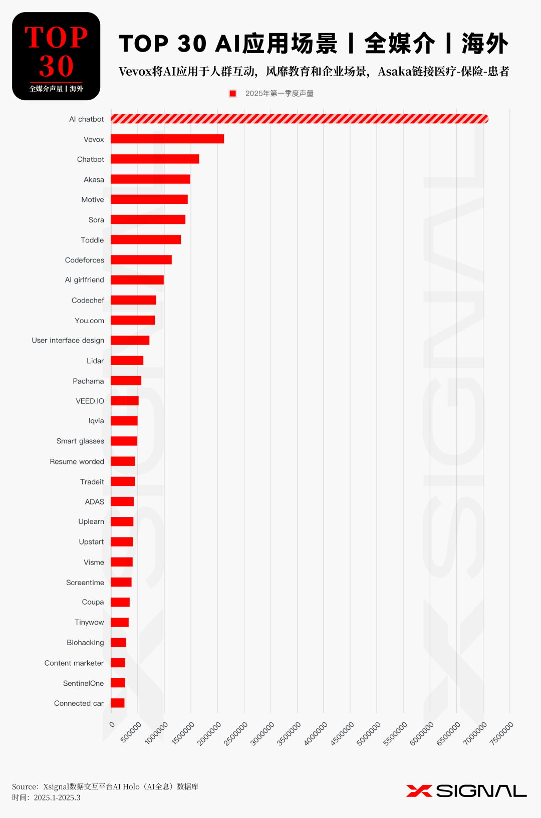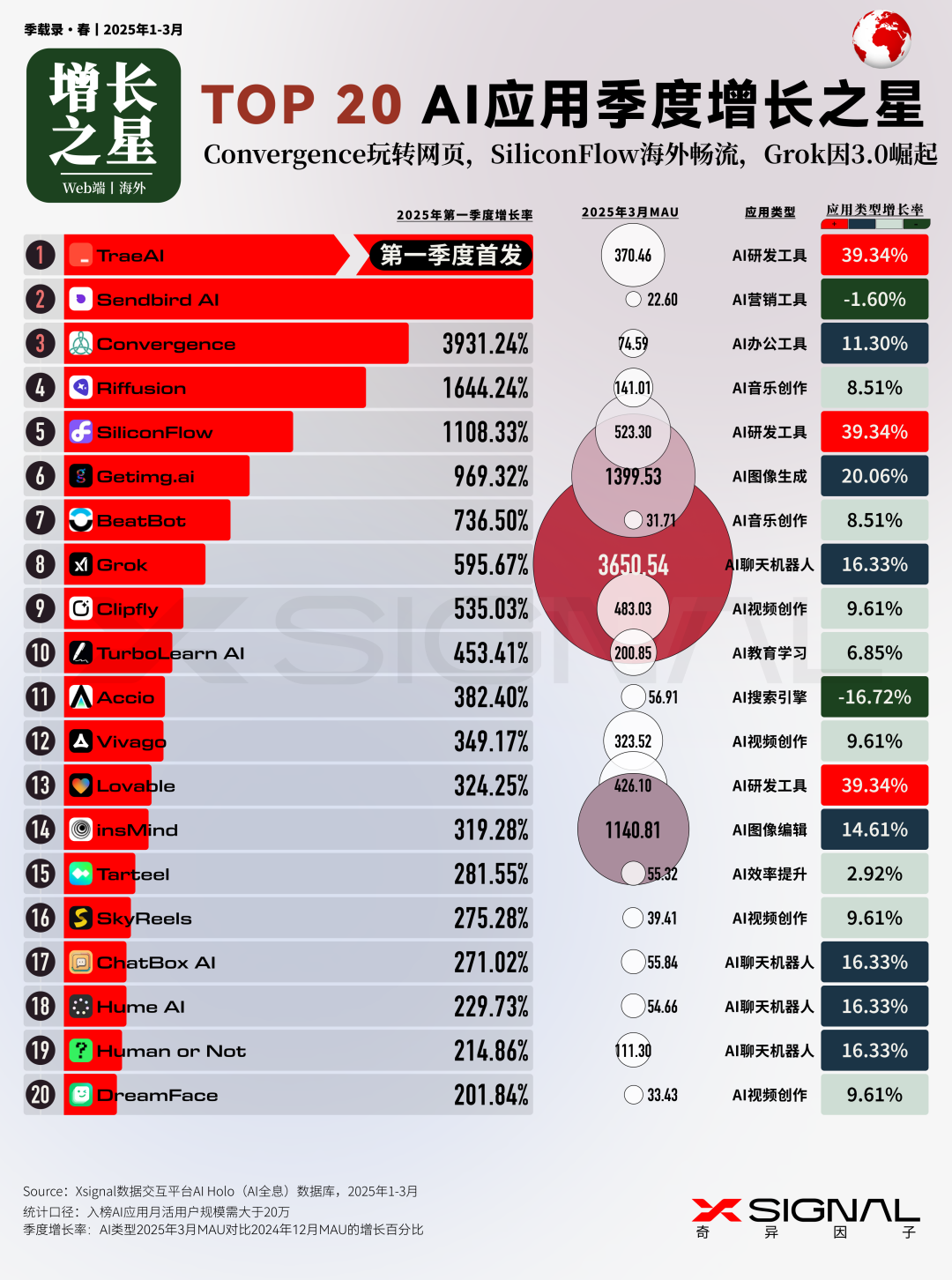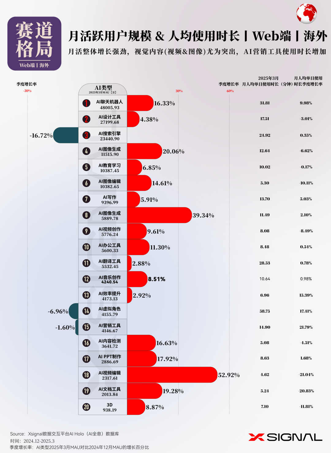 伴随人工智能技术的迅猛迭代,中国 AI 应用在全球市场的影响力正呈指数级攀升。 Xsignal AI Holo 数据平台 2024 年 12 月至 2025 年 3 月中国出海 AI 应用的详实数据,深入剖析其在海外市场的发展态势、整体格局与战略布局。