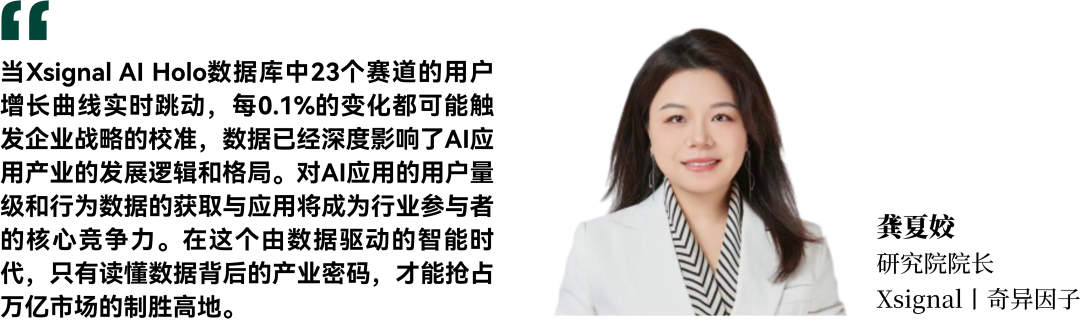 在这一变革的浪潮中,AI应用数据扮演了至关重要的角色。每0.1%的用户留存率变化都可能触发企业战略的校准。这种对数据的深度挖掘与分析,已经深刻影响了AI应用产业的发展逻辑。如今,对AI应用的用户量级和行为数据的获取与应用,已成为行业参与者的核心竞争力。在这个由数据驱动的智能时代,只有深入理解数据背后的产业密码,才能在万亿市场的竞争中占据制胜高地。