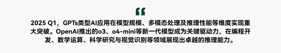 2025 年第一季度,GPTs 技术发展势头迅猛,在模型规模、多模态处理及推理性能等维度实现了重大突破。OpenAI 推出的 o3、o4-mini 等新一代模型成为关键驱动力,在编程开发、数学运算、科学研究与视觉识别等领域展现出卓越的推理能力。这些模型深度整合了网络实时检索、Python 代码执行、图像智能分析、文件内容解析等实用工具,并支持智能代理功能,能够依据复杂任务需求,自主调度、组合各类工具,高效解决实际应用场景中的难题。