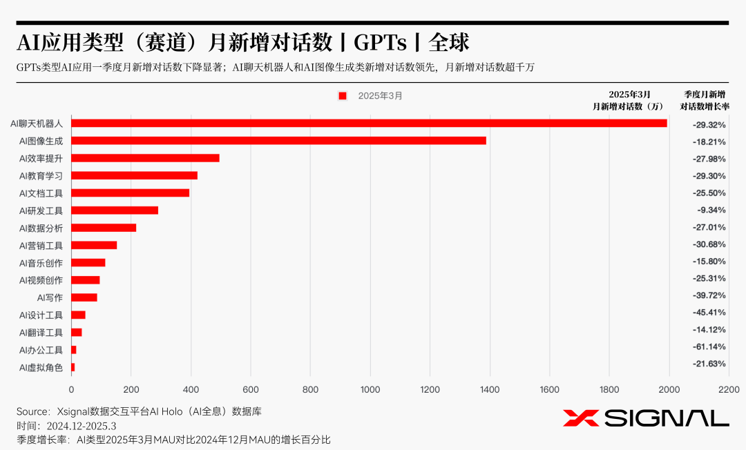 2024 年第四季度至 2025 年第一季度期间,全球 GPTs 类型的 AI 应用市场呈现出明显的结构性分化特征。Xsignal 数据显示,AI 聊天机器人以单月近 2000 万次的新增对话数持续领跑市场,这一现象主要源于其作为数字交互基础设施的独特定位。不同于其他垂直领域应用,聊天机器人凭借其自然语言理解能力和多场景适配性,已成功渗透至客户服务、生活咨询、娱乐社交等多个高频使用场景,形成了稳定的用户使用习惯。