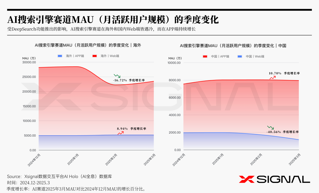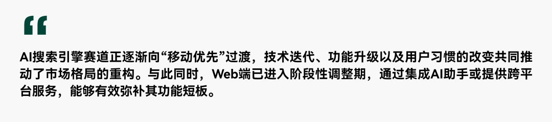 受 AI 聊天机器人类应用推出 DeepSearch 功能的影响,AI 搜索引擎赛道呈现出明显的分化趋势。在海外市场,AI 搜索引擎的 Web 端表现低迷,而 APP 端则持续增长;国内市场同样呈现出类似的趋势,用户正逐步向移动端迁移。