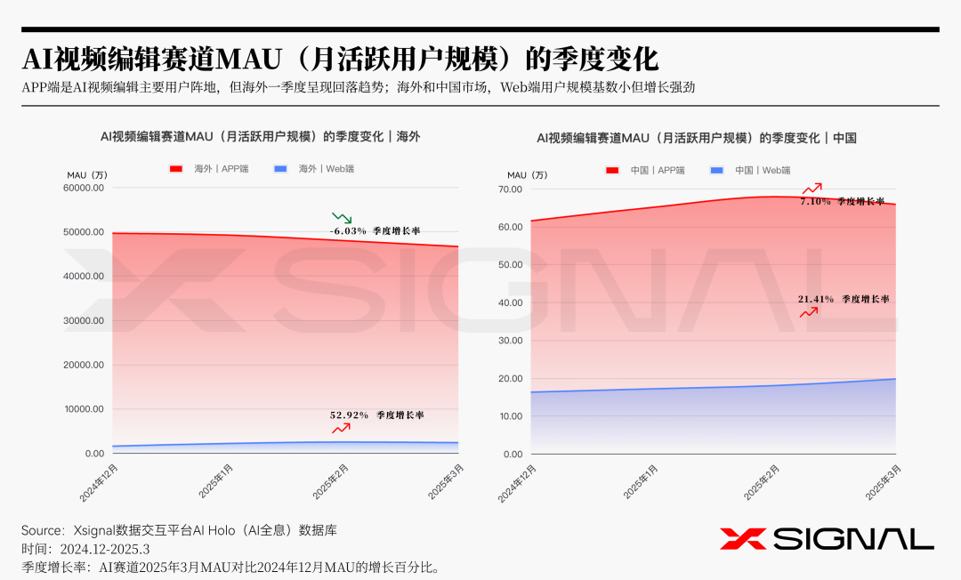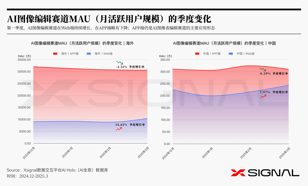 2025年第一季度,AI图像编辑领域呈现出“Web端增长,APP端承压”的全球共性趋势。海外市场和国内市场的Web端用户活跃度持续增长,而APP端则有所下滑。