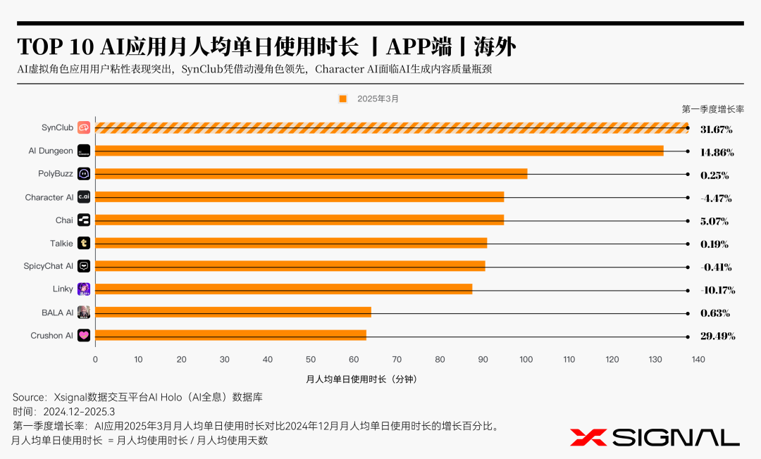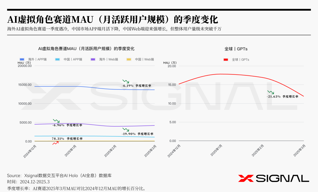 2025年第一季度,海内外AI虚拟角色赛道呈现出不同发展轨迹。中国Web端的高增长彰显了创新驱动的潜力,而海外市场则需要探索新的增长点,例如技术融合或场景拓展。GPTs则需要优化产品体验,提升差异化竞争力。