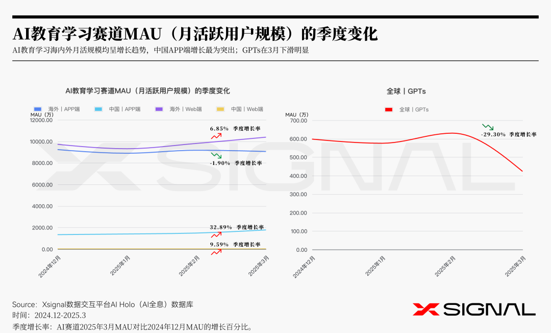 与此同时,GPTs的月活跃用户数(MAU)在第一季度下降了29.30%。这一趋势表明,在AI教育学习领域,用户正从通用型GPTs转向更垂直、专业的AI教育应用。