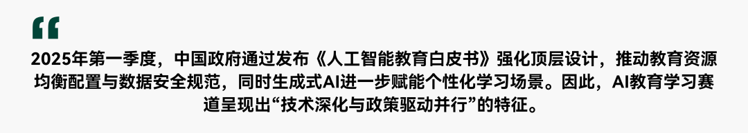政策与技术双轮驱动:2025年第一季度,中国政府通过发布《人工智能教育白皮书》强化顶层设计,推动教育资源的均衡配置与数据安全规范。同时,生成式AI进一步赋能个性化学习场景,使得AI教育学习赛道呈现出“技术深化与政策驱动并行”的特征。