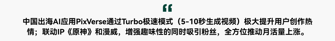 在2025年第一季度,北京爱诗科技旗下的出海应用PixVerse月活跃用户(MAU)增长超过13倍,达到913.36万,领跑AI视频创作赛道。其核心优势在于快速生成视频和丰富的AI特效。PixVerse的V3.5模型配备Turbo模式,平均10秒即可生成一条视频。