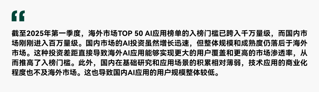 海外市场:高基数下的显著增长。2025年第一季度,海外AI应用月活跃用户(MAU)规模已攀升至9.80亿,单季度增长率达15.08%。在用户基数逼近10亿门槛的背景下,仍能实现超15%的环比增幅,印证了海外市场仍处于高速扩张周期。当前行业呈现两大核心趋势:一方面,AI应用正突破早期技术受众圈层,加速向普通消费者市场渗透;另一方面,若延续当前季度增长动能,预计2025年末全球活跃用户规模将跨越20亿里程碑。这一数据不仅揭示了AI技术商业化落地的加速度,更预示着全球数字生态正经历由AI驱动的结构性变革——用户增长曲线陡峭化、应用场景多元化与市场成熟度提升形成共振效应,为行业长期发展注入强劲动能。