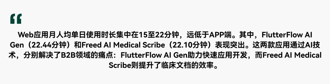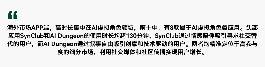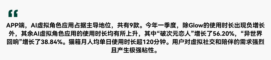 海外市场APP端,AI视频创作和AI效率提升一季度爆发。AI虚拟角色赛道用户粘性突出,月人均使用时长首次突破100分钟。AI聊天机器人保持稳定发展,月人均使用时长增长14.72%至18.7分钟。