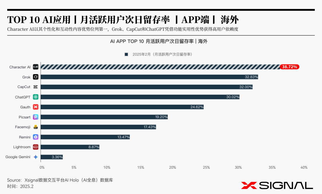 技术与体验的平衡:高留存率的应用,如Character AI和Grok,在技术实力和用户体验上达到了较好的平衡。Character AI通过趣味性降低了使用门槛,而Grok则通过功能深度吸引了对知识有更高需求的用户。Character AI和Grok的成功表明,AI应用需要在功能创新和用户体验之间找到平衡。通过提供差异化服务(如娱乐性或深度知识解答),应用能够更好地吸引目标用户群体。
