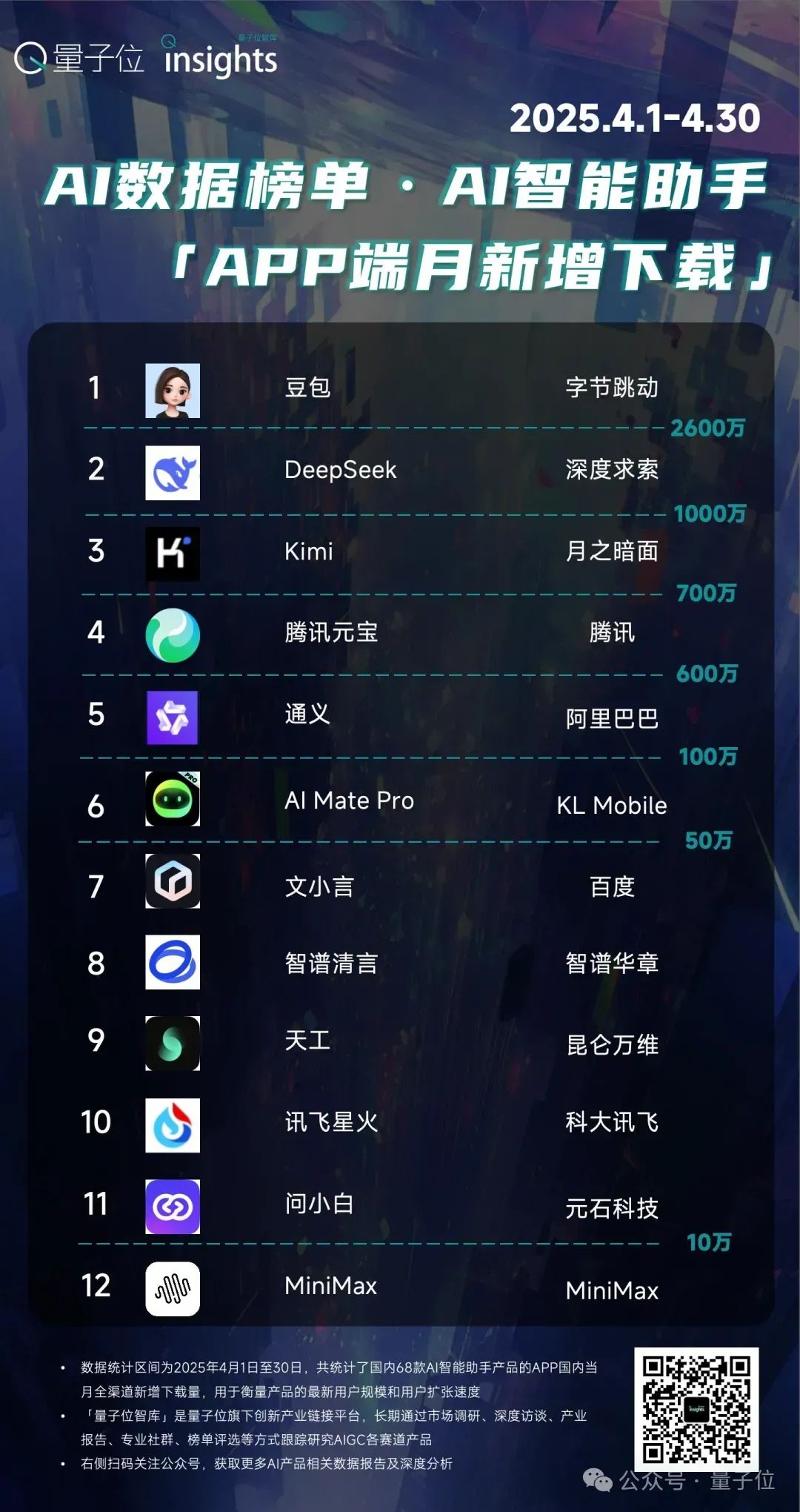 字节则继续加持豆包智能助手,基于原有的内容生态积累,牢牢捍卫住他们榜首之位,截至4月底,豆包在25年的新增下载已近亿,累计用户规模近3亿。