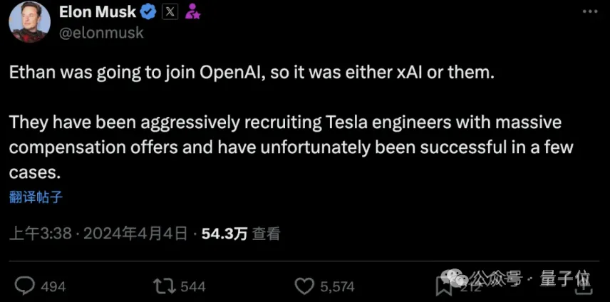 当时的起因是特斯拉视觉科学家Ethan Knight离职,加入到了马斯克的xAI公司。结果没成想过程十分曲折,因为他差点就要去OpenAI的,但是被马斯克力挽狂澜: