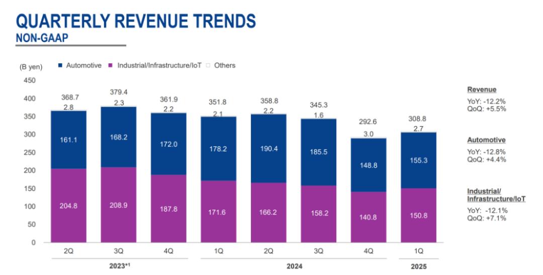 瑞萨的财报也不太好看。瑞萨2025年第一季度(1 月-3 月)的财务业绩(基于非 GAAP)显示,销售额同比下降 12.2% 至 3088 亿日元,毛利率同比增长 0.1 个百分点至 56.7%。