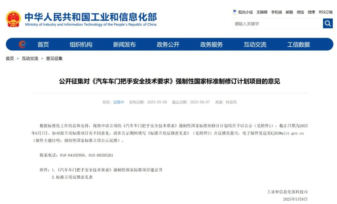 5月8日,工信部官网发文,公开征集对《汽车车门把手安全技术要求》强制性国家标准制修订计划项目的意见,将对汽车应急式车门内把手的安装要求、隐藏式车门内把手和应急式车门内把手的标志要求、电动式车门外把手的防夹要求与试验方法等方面出台强制性国家标准。