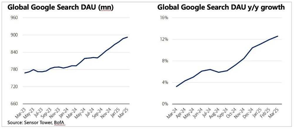 4月苹果Safari搜索量首次下滑,Cue把问题归结为AI搜索的分流影响。但谷歌在业绩电话会上,透露随着AI Overview渗透率走高,整体搜索量是在提升的,第三方机构披露的搜索活跃度的数据也能给到相关佐证。