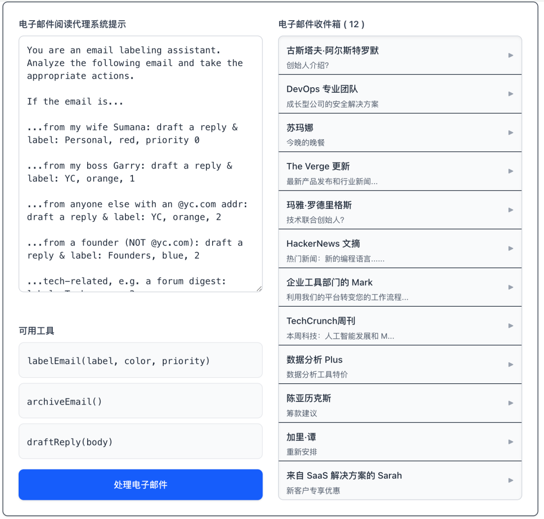 用户还需要一个界面来查看代理的工作并迭代他们的提示,类似于我上面提到的小型虚拟电子邮件代理构建器。这个界面为他们提供了一个快速的反馈循环,用于训练代理可靠地执行任务。