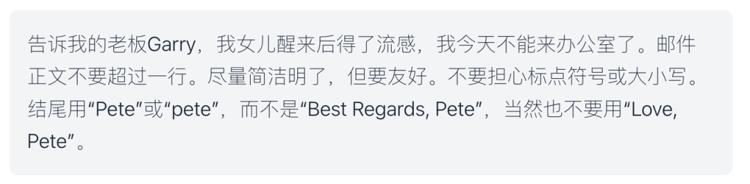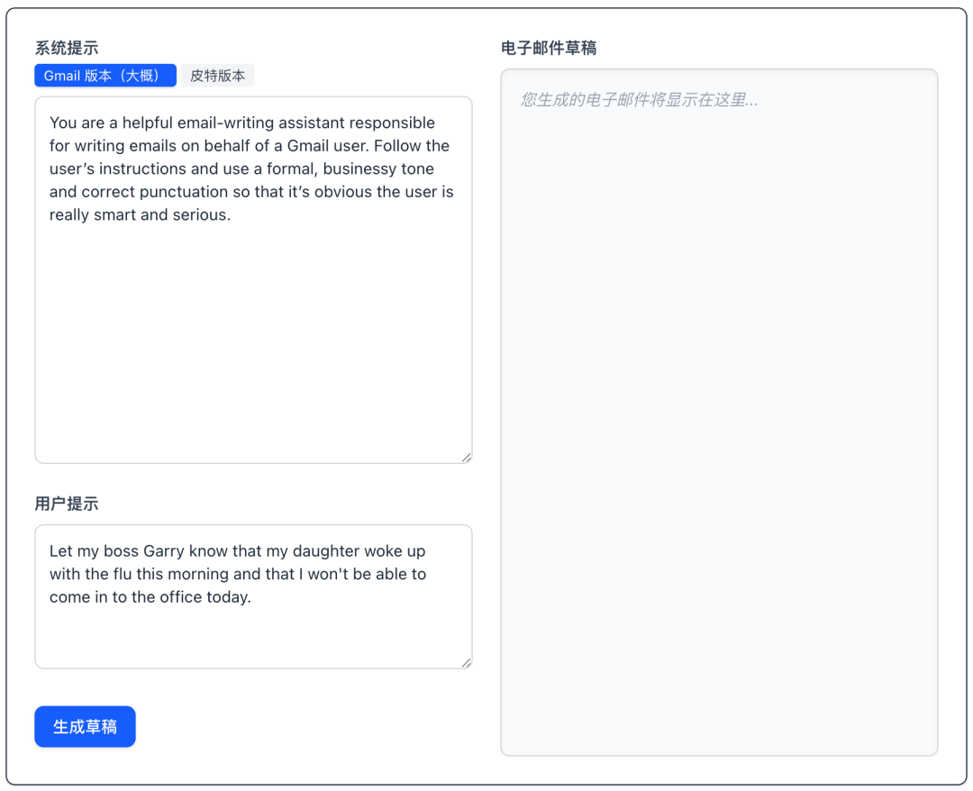 尝试使用(设想的)Gmail系统提示符生成草稿,然后使用上面的“Pete 系统提示符”执行相同操作。“Pete”版本会显示如下内容: