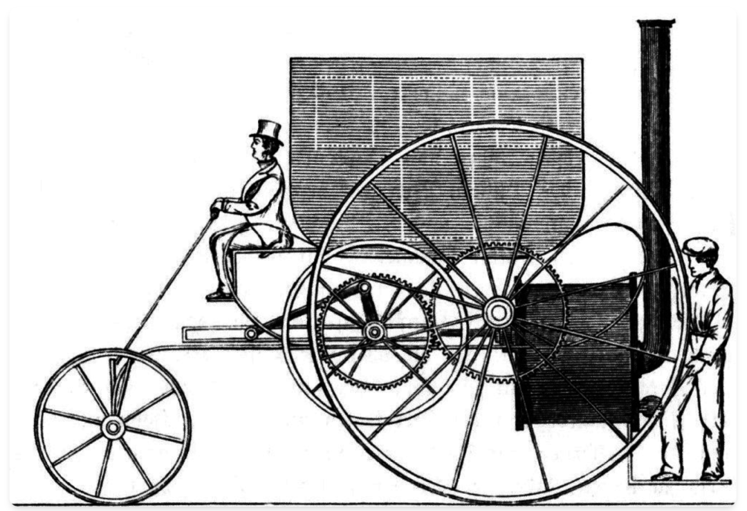 “无马马车”指的是早期的汽车设计,它大量借鉴了之前的马车。以下是我在维基百科上找到的一张1803年蒸汽马车设计图: