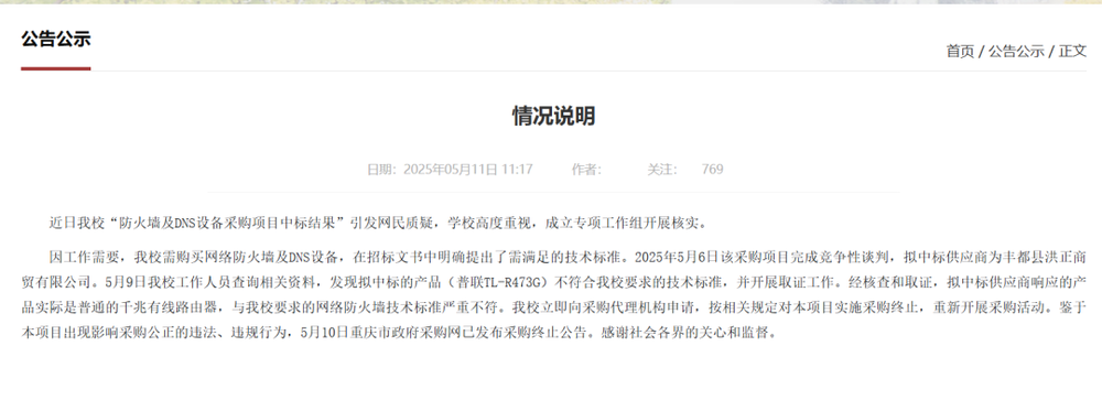 因工作需要,我校需购买网络防火墙及DNS设备,在招标文书中明确提出了需满足的技术标准。2025年5月6日该采购项目完成竞争性谈判,拟中标供应商为丰都县洪正商贸有限公司。5月9日我校工作人员查询相关资料,发现拟中标的产品(普联TL-R473G)不符合我校要求的技术标准,并开展取证工作。经核查和取证,拟中标供应商响应的产品实际是普通的千兆有线路由器,与我校要求的网络防火墙技术标准严重不符。我校立即向采购代理机构申请,按相关规定对本项目实施采购终止,重新开展采购活动。鉴于本项目出现影响采购公正的违法、违规行为,5月10日重庆市政府采购网已发布采购终止公告。感谢社会各界的关心和监督。