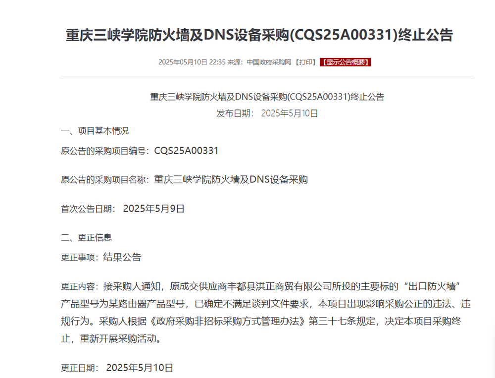 记者就此事搜索发现,5月10日晚10时许,中国政府采购网发布了一则《重庆三峡学院防火墙及DNS设备采购(CQS25A00331)终止公告》,更正信息一栏中显示:“接采购人通知,原成交供应商丰都县洪正商贸有限公司所投的主要标的‘出口防火墙’产品型号为某路由器产品型号,已确定不满足谈判文件要求,本项目出现影响采购公正的违法、违规行为。采购人根据《政府采购非招标采购方式管理办法》第三十七条规定,决定本项目采购终止,重新开展采购活动。”更正日期为5月10日。