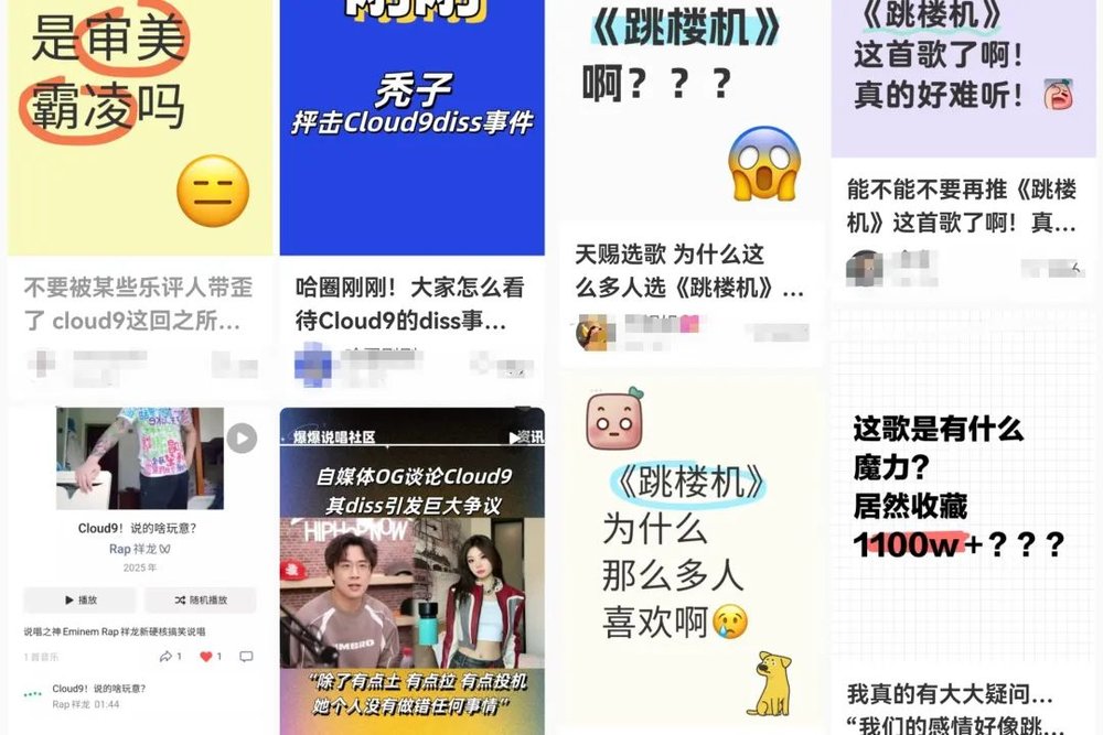 比如《跳楼机》,目前的吐槽大多集中在“一顿吃了几个周杰伦、队长”的争议,以及非主流土味、口水歌等拉低大众审美的角度。与《跳楼机》的吐槽相似的,Cloud9这首Diss曲也被诸多乐评人给予土、拉、质量差等负面评价。乐评人艾德宝(ADBABY打你屁屁)更是称其为“VaVa的腔调、张子豪的Flow、新秀参加节目写爆点的方式、吸引老舅的听众”,这一评价也得到了大量说唱爱好者的认同。