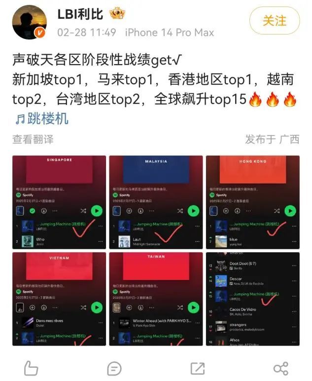 截至当下,《跳楼机》已在QQ音乐、网易云双平台收获超过1000万收藏量,其中QQ音乐热歌榜在榜137期,刚刚跟薛之谦的《无数》《崇拜》一起达成了腾讯音乐榜认证的双白金认证;在新加坡、马来西亚、泰国等东南亚市场和港台地区也是一路高歌猛进。