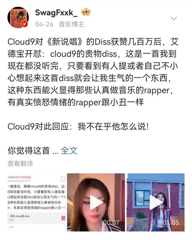 同样地,凭借一首跟爱奇艺《中国新说唱2025》贴脸开大的Diss,说唱新人 Cloud9确实从“查无此人”的状态被圈内知晓,被戏称“碾压VaVa”“下一个VaVa”;甚至还借此获得胡彦斌认证,直播晋级腾讯视频的新音综《让我来唱》。