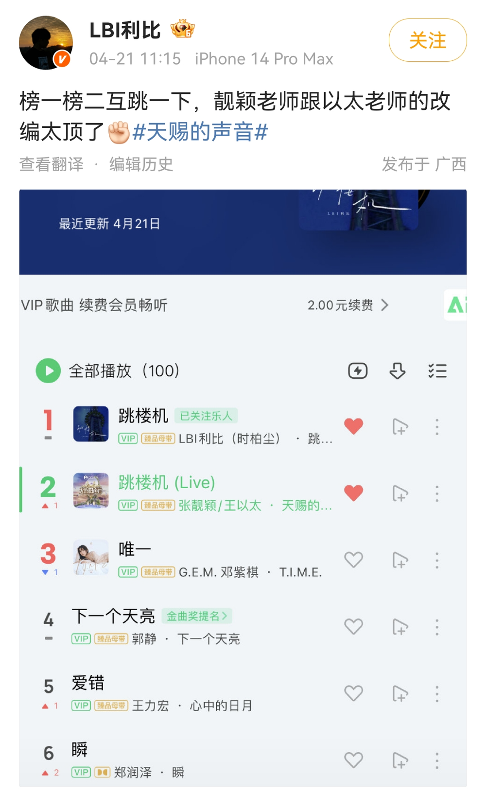 正是因此,不少作为生产者的音乐人,难免要放弃一定的雅俗不共赏原则,毕竟吃饱才是最重要的。像是在《天赐的声音第七季》中,王源、刘宇宁、王赫野等均表示想选《跳楼机》,但由于演唱难度,最终落在了演唱机能Next Level的张靓颖与搭档王以太身上,并呈现出了颇受欢迎的“去贱版”《跳楼机》。