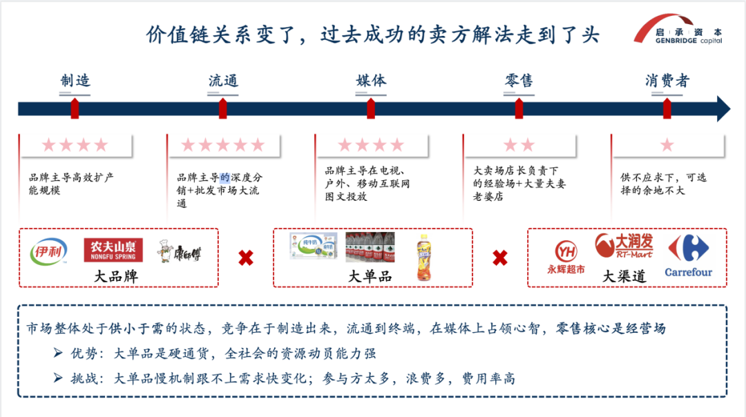 我们觉得最本质的变化,还是价值链的关系发生了改变。过去三十年,本质上是一个由品牌主导的价值链创造过程。因为品牌主导价值链创造,所以利益分配权来自品牌,进而形成了“大品牌+大单品+大渠道+深度分销”的模式,诞生了一批像伊利、农夫、康师傅这样非常擅长做价值链主导和模式执行的公司。