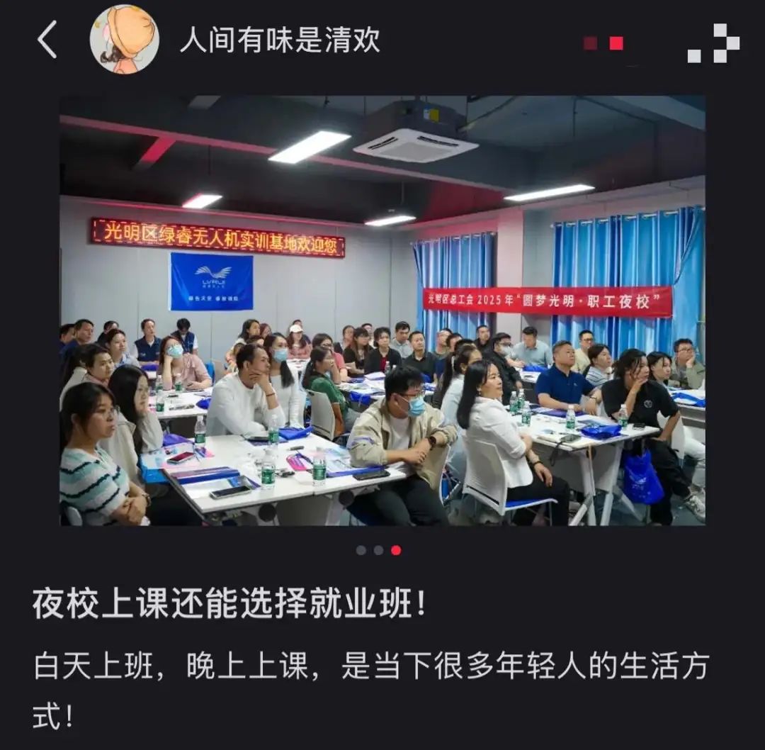 “以前夜校的招牌课程是曲艺,现在变成了能让人吃饱饭的手艺。比如直播运营、AI工具的使用、无人机驾驶等等。这些课程大家平时想学,很难找到正规的培训班,但在夜校,不但学费低、时间灵活,甚至一些学习门槛比较低的课程结束后,还能分配平台合作的兼职单子,直接安排上岗赚钱。”