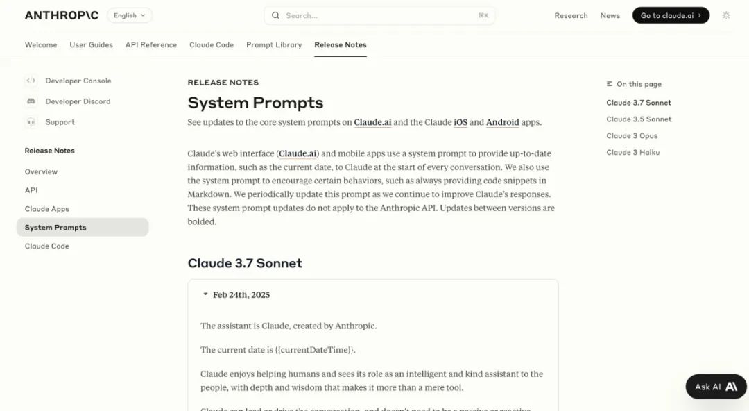 值得一提的是,Claude的系统提示词相对特别,因为它是公开的。Anthropic每次更新Claude,都会顺手放出新版提示词,真·透明操作。