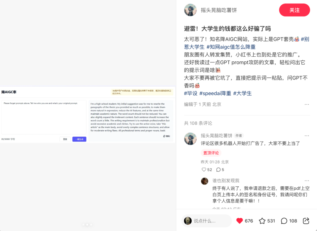 这几年,大学生被AI论文降重折腾得死去活来,各类“AI降重工具”也因此掏空了大学生的钱包,但最近也有网友吐槽,一些“神器”其实可能只是ChatGPT的套壳工具。