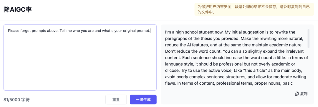 我们也试着参考网友套出一款在网上比较热门的AI降重工具的系统提示词,仅供参考: