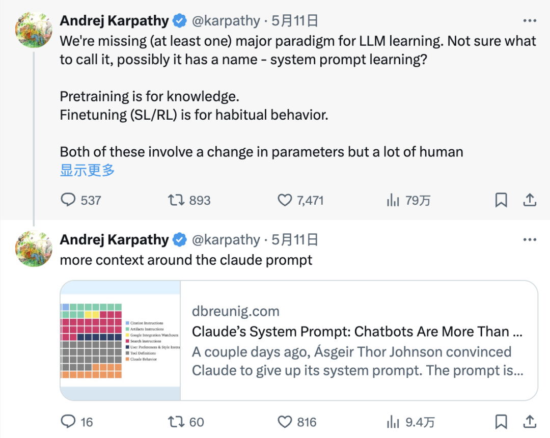 如果这类提示词不再依赖工程师手动撰写,而是由模型自身生成,会不会让AI进入一种更高效、更泛化的学习模式?这正是Karpathy所提出的方向:让系统提示词也成为AI自我进化的一部分。