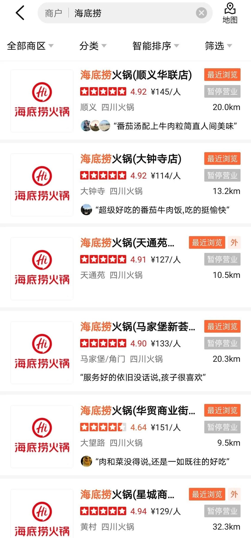 内参君登陆大众点评App,发现北京共有7家海底捞门店暂停营业,分别是顺义华联、华贸商业街、马家堡新荟城、黄村星城商厦、郎福广场、天通苑华联、大钟寺等门店。