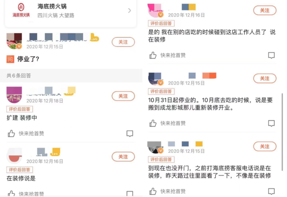 此外,参君分别通过大众点评App查询、实地探访、致电门店的方式,与不同城市正在“装修”或“暂停营业”的海底捞门店取得联系,发现了一些蹊跷的共同点: