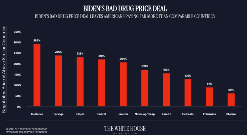 白宫为周一的发布会准备了一块展示板,显示拜登时期的“医保集采”谈判价格与其他“类似国家”的定价差异。白宫指出,默沙东的降糖药西格列汀(Januvia)即便在降价后,也要比其他类似国家高出289%。
