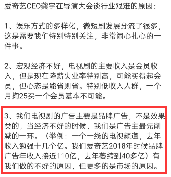 爱奇艺创始人龚宇发表演讲提及,视频平台广告收入由2018年接近110亿萎缩到去年的40多亿,可想而知平台在剧集招商方面会何其焦虑?这也决定了演员流量决定番位的底层逻辑。