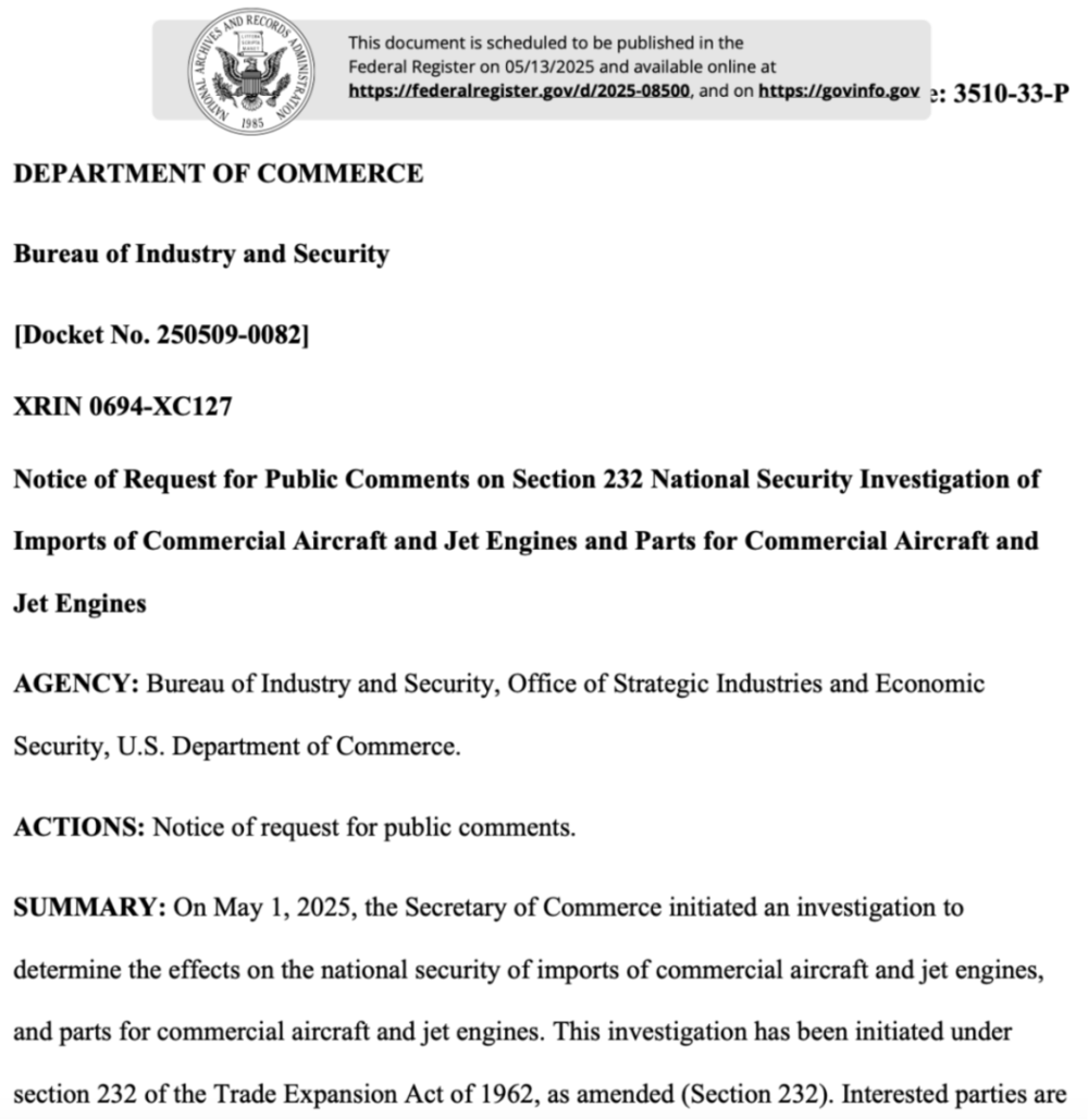文件显示,美国商务部自5月1日起启动调查,对商用飞机、飞机发动机和零部件等的进口依赖程度等进行调查,准备开征关税。