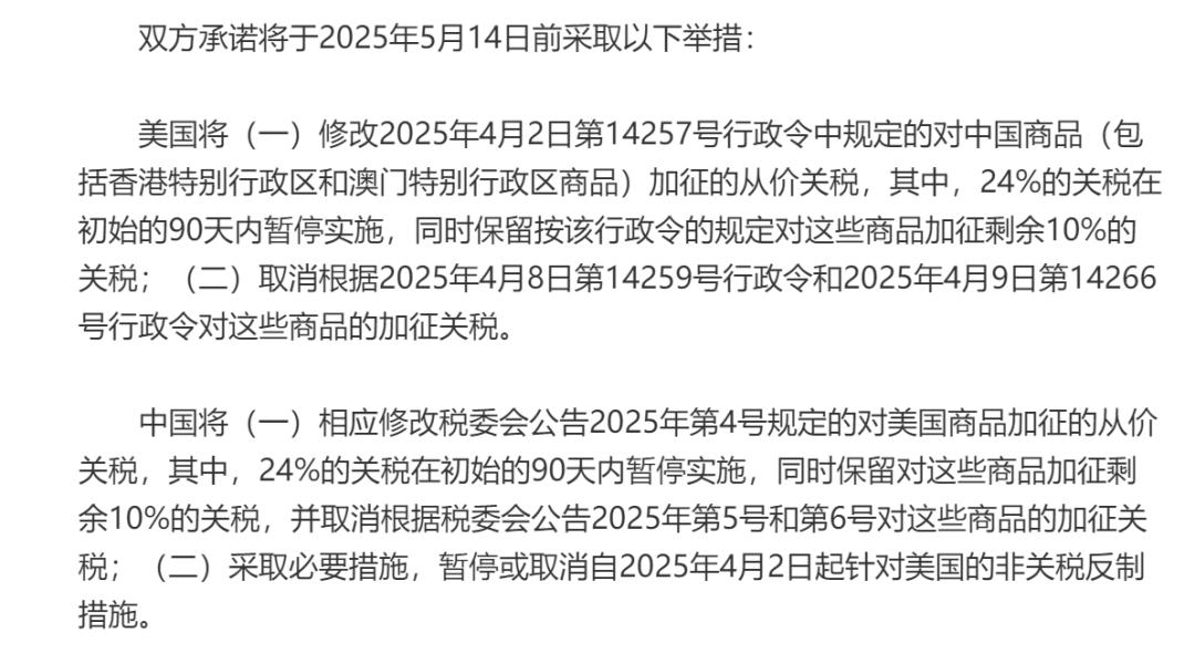 5月12日,关税果然降了下来。据新华社消息,中美发表《 中美日内瓦经贸会谈联合声明 》,双方将在 5 月 14 日前采取一系列措施降低关税。