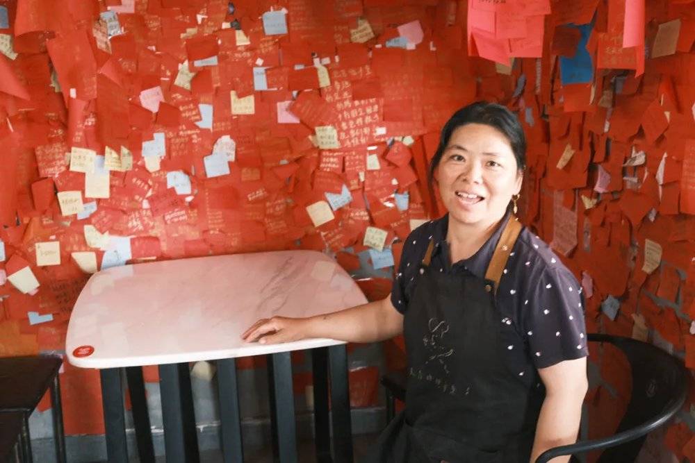 玉霞和店里的“网红座位”,墙上贴满了明星粉丝的留言。(图/崔斯也 摄)