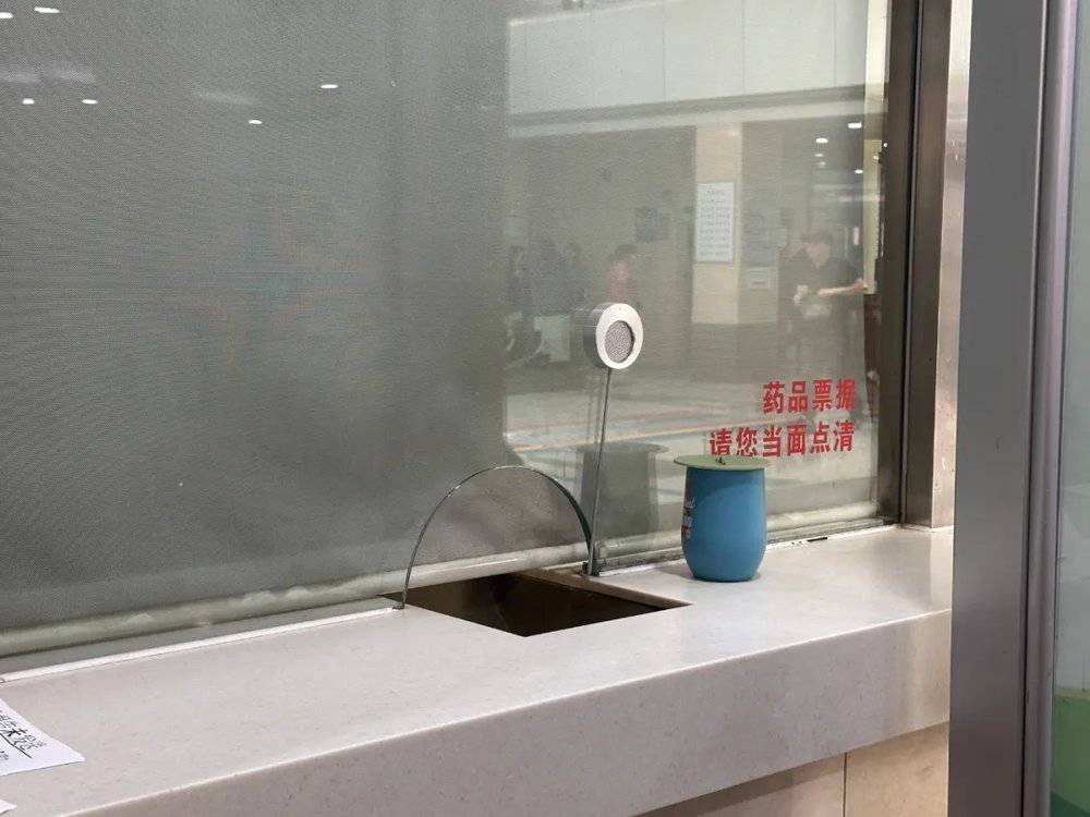 每隔一会儿,她会悄悄地走到角落里关闭的挂号窗口,那里放着她的水杯。